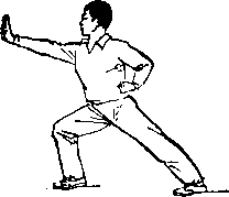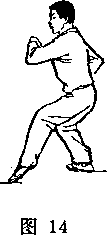左脚后撤一步,成右弓步, ?同时两掌由两侧弧形上举,到头 前上方时,两掌叠并(右手在下),然后向下拍击,两手位于腰 前;眼向前看(图15)。