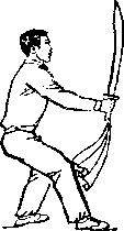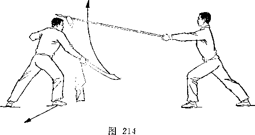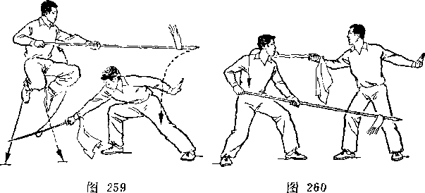 乙左腿屈膝成左弓步;上体前屈,低头闪躲;甲右手握刀继续向左、向下弧形抹至乙体右侧;目视刀(图269)。