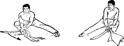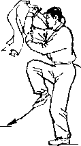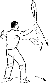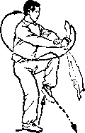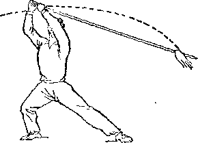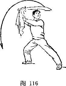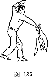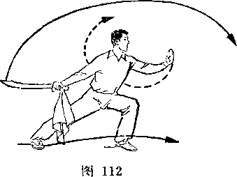 旋,使刀顺乙绞把之势向左、向下划弧,随即右前臂继续内旋, 使刀身与地面成平行,刀刃翻转向右,横扫乙两腿,同时左手平 举于体左侧;目视刀(图258)。