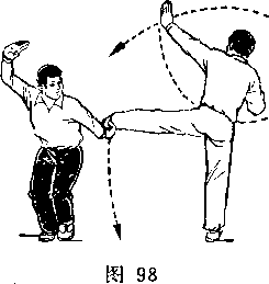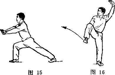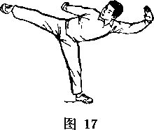 上体左倒;右脚向右上方踹出;眼看右脚(图17)。