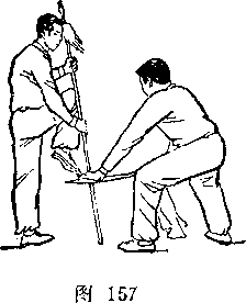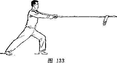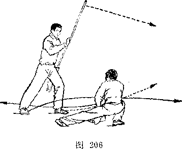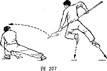 (2)乙左腿屈膝成左弓步;两手握枪向前下方扎甲右腿;目 视枪尖(图246)。