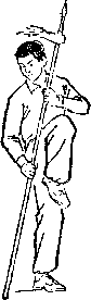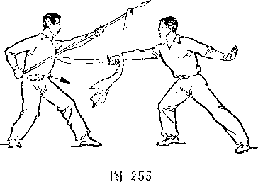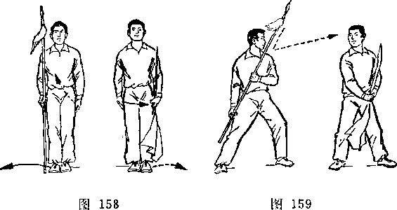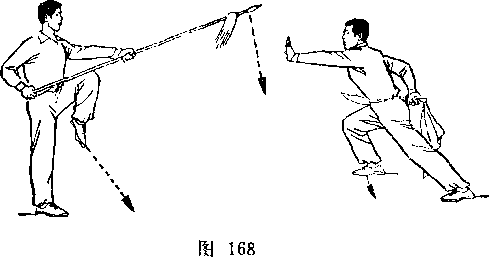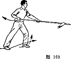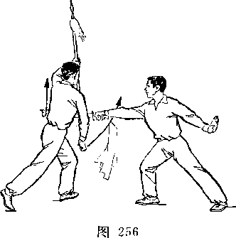 乙身体左转,两腿微屈,右脚跟提起,体重偏于左腿;同时右手握把端,向左前方推出,枪杆竖直,枪尖向上,格挡甲刀;目视甲刀(图256)。