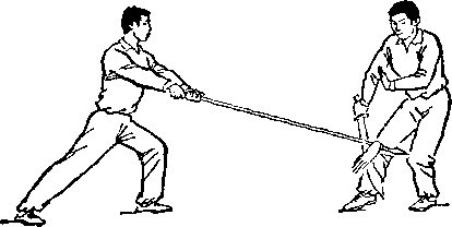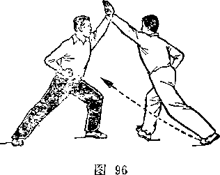 在对练的训练中,除遵循单练的训练方法外,还应加强分解 动作和双方配合动作的训练。分解动作的练习,以提高个人专项 技术水平为主,例如:持枪者可对着树或別的物体练习各种扎枪 动作,掌捏枪扎出后的准确性和稳定性;双方配合动作的练习, 以掌握好进攻与防守动作的时机为重点。如:单刀对枪套路中, 双方可多配合做甲持刀劈头、乙低头闪躲的动作。甲掌握好劈刀 的路线和速度,乙则练习把低头动作完成在甲劈刀将至的一刹那 间。多做这类动作的配合练习,可以逐步掌握对练项目的运动规 律和技术要领,提高动作的质量和套路的演练技巧,有效地防止