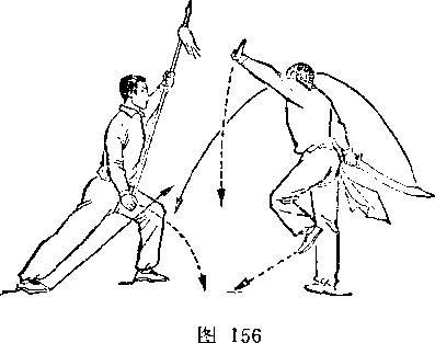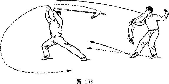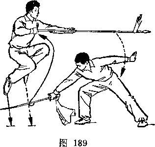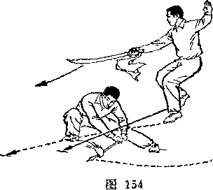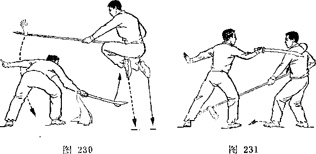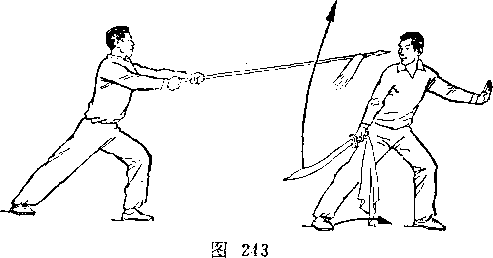 甲左脚向前半步,右臂外旋,刀尖向后、向右平绕半周,刀刃朝前,刀尖朝右后方,举于右上方,? H视乙。乙右腿全蹲,左腿伸直,成左仆步;两手握枪,由左向后向右下抡转一周,横扫甲两腿;枪杆与地面平行,目视甲(图239)。