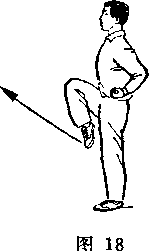 (2)右小腿向前弹踢,脚面绷平,腿伸直,眼看前方(图19)。