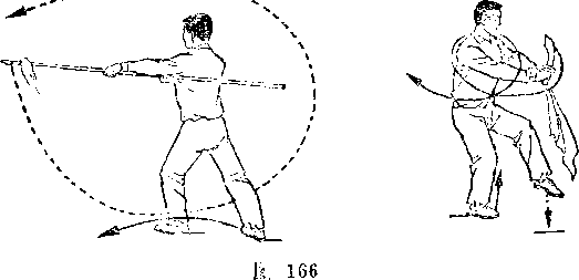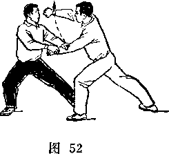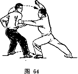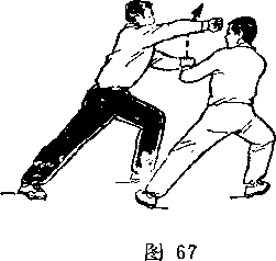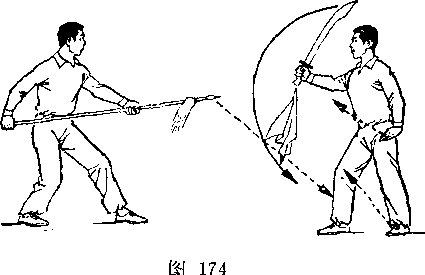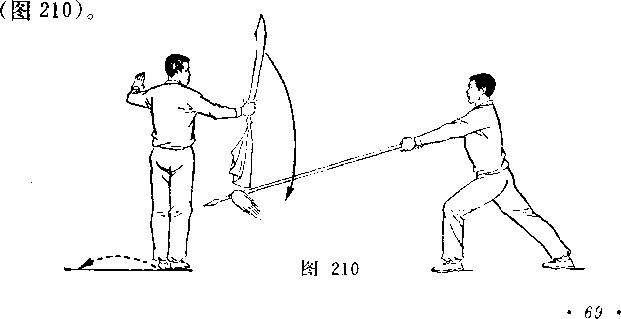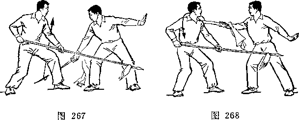 (2)乙两脚蹬地跳起;同时枪身由左向右划弧横击甲头部; 目视甲(图266)。