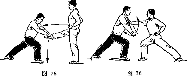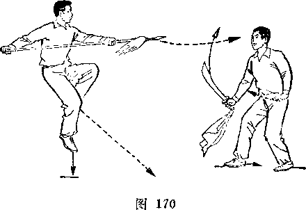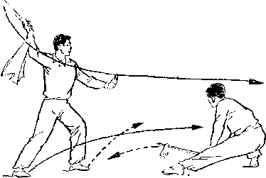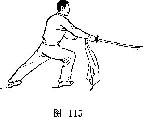 甲持刀继续右扫。乙两手握枪由甲体前划弧下落;两脚 落地,两腿屈膝微蹲,?目视甲(图267)。