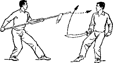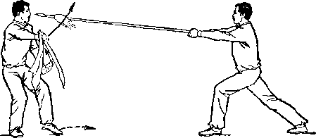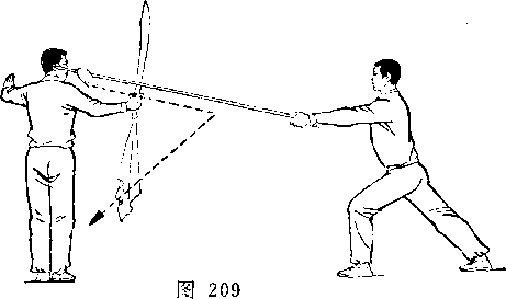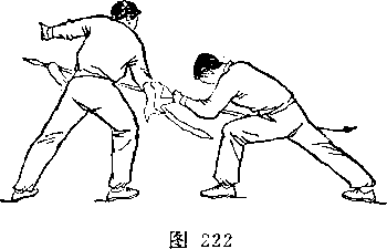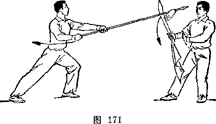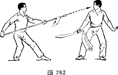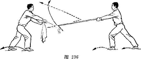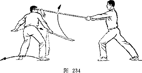 乙右手将枪抽回,随即左脚上半步,右脚跟进半步,仍成左 弓步,?两手持枪向前平扎甲腹部;目视枪尖。甲左脚后撤一步, 右臂内旋,右手提刀,刀身横平下按乙枪;左手附于右腕内恻; 目视乙(图236)。
