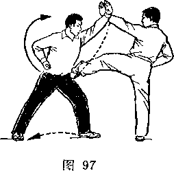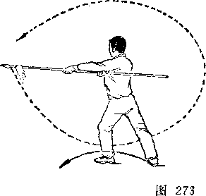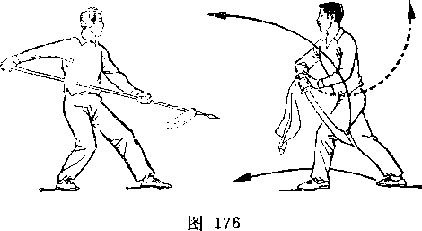 甲以右脚为轴,左腿屈滕提起,身体向右后转,?右手握 刀随体转;目视刀。乙右后转体,左脚向前一步,左膝微屈,?两 手握枪,枪尖由左下方向上摆起,随体转向前划弧, ?同时右手滑 握枪中段,经腹前向左腋下绕行;目视枪尖(图273)。