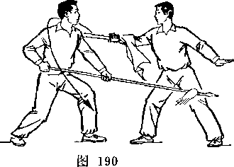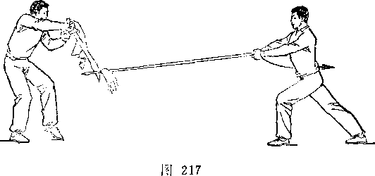 乙苋心后移,两腿微屈;右手向后抽枪,左手滑握枪前段,枪杆微斜置于右腰侧;甲重心后移,两腿微屈;甲乙对视(图262)。
