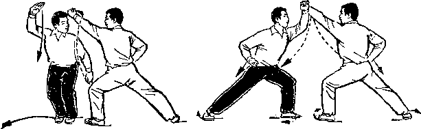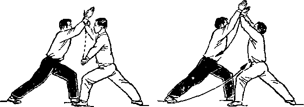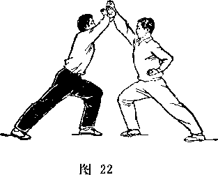 一、 初学时,可用喊口令的办法,使第一动先由一方完成进 攻动作,第二动再由另一方做对付对方这一方法的相应动作。采 用这种方法练习,常会产生双方距离太近、动作伸展不开的感觉。 这是因为套路中双方的动作本来是连接的,攻守、进退是同时进 行的,现在动作分解开来,一方进而另一方不退,就会出现距离 太近的情况,但为了使初学者明确和掌握套路中每一个动作的实 用意义,并使动作合乎技击要求,适于先采用这种方法。