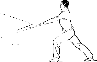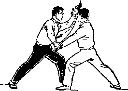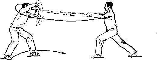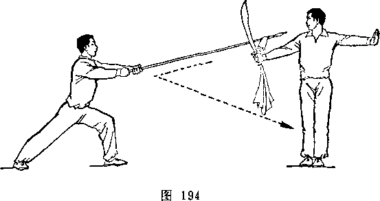 再如对练中刀的劈头动作,既要呈现出刀的勇猛快速的特点, 又要照顾对方低头闪躲时的安全。在刀下劈时,切忌象单练动作 那样立劈直砍,应在刀即将接近对方背部时,右前臂稍外旋,使 刀刃斜向前微翘,随即用刃后的刀身沿着对方背部快速的划弧下 劈。