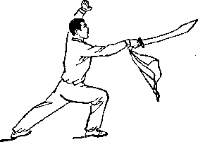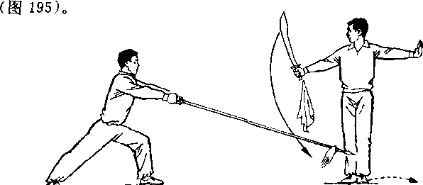 甲右腿屈膝前弓;右手握刀,向前扎乙左肋,刀尖朝前,刀刃朝下;目视刀(图255)。