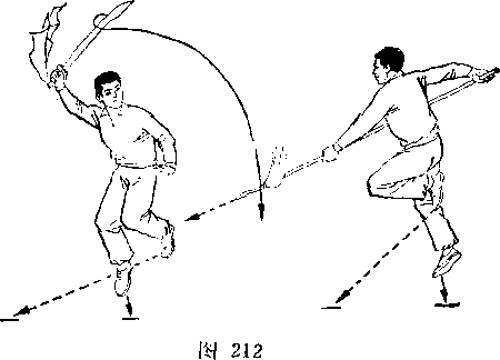 甲左脚蹬地跳起,右脚向前跨出,闪躱乙枪;同时右手握刀,刀刃向前扫抹甲头部;目视刀(图240)。