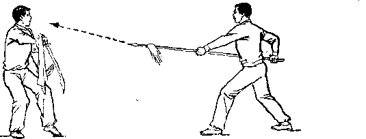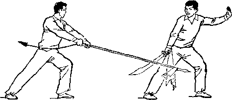 乙右手将枪抽回,同时左脚上半步,右脚跟进半步,仍成左 弓步;两手握枪向前上方扎甲头部;目视枪尖。甲右脚后撤一