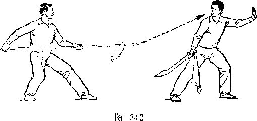 段,枪尖朝前,枪杆平置干腰前;目视甲。甲重心右移,左脚微 后撒,脚尖虚点地面,右手握刀,由下向后、向上划弧举起;刀 尖朝上,刀刃朝后;左掌前平举,掌指向上,?目视乙(图248)。