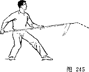 乙重心后移,两腿屈膝;右手向后抽枪,左手滑握枪中 段,枪尖朝前,枪杆平置于腰前,?目视甲(图245)。