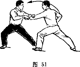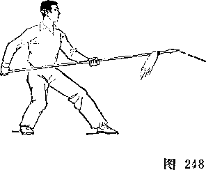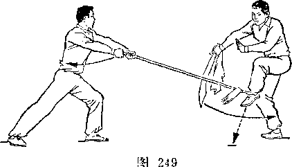 甲左脚于右脚前落地,脚尖外展,两腿交叉微屈。乙重 心后移,两腿微屈,右手向后抽枪;甲乙对图250)。