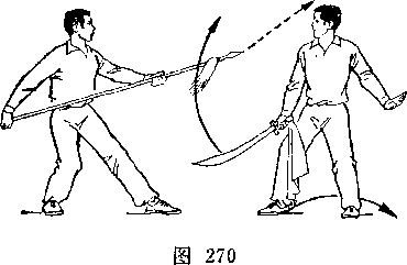 乙两手握枪向前上方扎甲头部右侧。甲右脚后撤一步,上体右转;右手握刀向右上方弧形环挂乙枪,刀尖朝上,刀刃朝前;甲乙对视(图271)。
