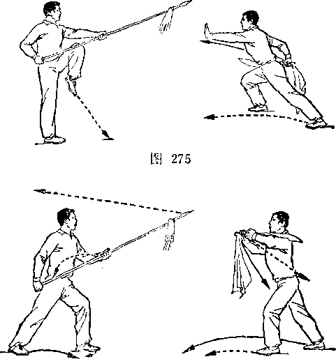 左腿屈膝前弓,?两手握枪,枪尖朝左上方,枪杆斜置于体前;甲乙对视(图276)0