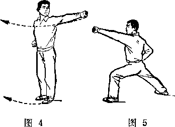 上体左转,左臂侧平举;左手握拳,拳眼斜向下;右拳 抱于腰间;眼看左拳(图4)。