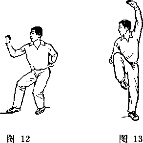 右臂由右上方向右下方弧形抡挂,右手在体右后侧变勾手; 左掌举于头前上方,掌指向右;上体右拧微前倾,?同时右腿屈膝 提起;眼看右前下方(图13)。